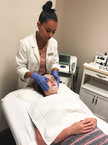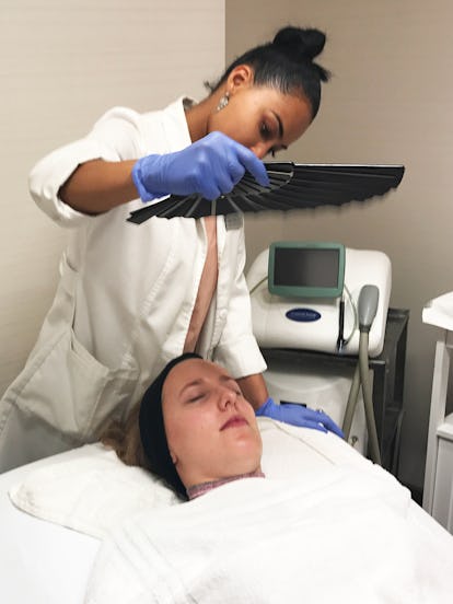 Voor mijn eerste chemische peelingreis ging ik naar Dr. David J. Goldberg, een in NYC gevestigde dermatoloog bij de Skin Laser & Surgery Specialists of NY and NJ. Nadat hij mijn gezicht heeft bekeken, vertelt hij me dat ik “niet probeer rimpels te verhelpen… je probeert je huid er gezonder uit te laten zien”, wat betekent dat ik een goede kandidaat ben voor een lichte, PCA SKIN chemische peeling. Volgens de ASPS bevatten dit soort lichtere peelings vaak “combinaties van alfahydroxyzuren en bètahydroxyzuren, zoals glycolzuur, melkzuur, salicylzuur en maleïnezuur” – allemaal ingrediënten die je waarschijnlijk al eerder in lagere percentages hebt gezien op de huidverzorgingsproducten in je badkamer.