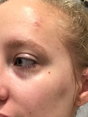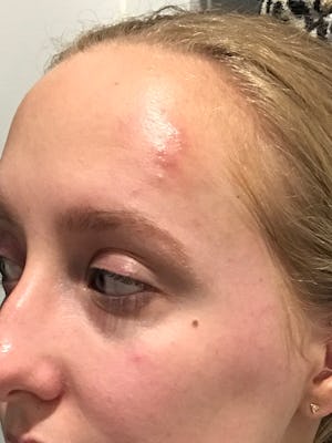 Ik ben normaal niet zo’n puistjesgevoelig persoon, maar een paar dagen voor mijn peelingafspraak kreeg ik een leuke uitbarsting van acne op mijn voorhoofd. Ik had geprobeerd mijn gezicht in te smeren met de gebruikelijke spot treatments, maar de puistjes werden maar niet kleiner. Soto bracht wat extra tijd door met de tweede laag – PCA Peel Hydroquinone Free, die 12 procent salicylzuur bevat – op het smetgebied, en ze begonnen onmiddellijk af te nemen. De foto links is vóór mijn peeling; de foto rechts is zeven dagen later.
