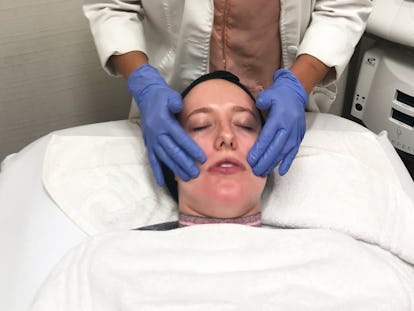 Ik heb eerder producten gebruikt die lagere percentages zuren bevatten, zoals glycolzuur en ascorbinezuur, dus ik ben gewend aan een beetje tinteling bij mijn huidverzorgingsroutine. De peeling die Soto bij mij gebruikte begon zonder veel gevoel, maar de laatste laag zuur – die bestond uit 20% melkzuur en 10% TCA, vergeleken met 12 en 6% in de eerste laag – veroorzaakte bij mij een behoorlijk hevige prik. Het voelde aan als een echte zonnebrand of het krijgen van een tatoeage, maar het duurde maar ongeveer een minuut. Nadat Soto de verzachtende moisturizer en zonnebrandcrème had aangebracht (en mijn gezicht een beetje had opgewaaid, zoals op deze foto te zien is), verdween de pijn volledig.